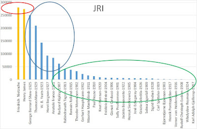 Έτσι, συγκρινόμενος με τους 29 έως τώρα νομπελίστες (1901-1929) και τον προπορευόμενο ως τώρα Χένρι Τζέιμς, έχουμε: